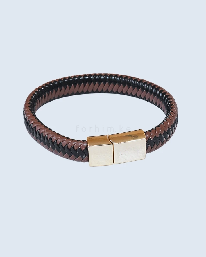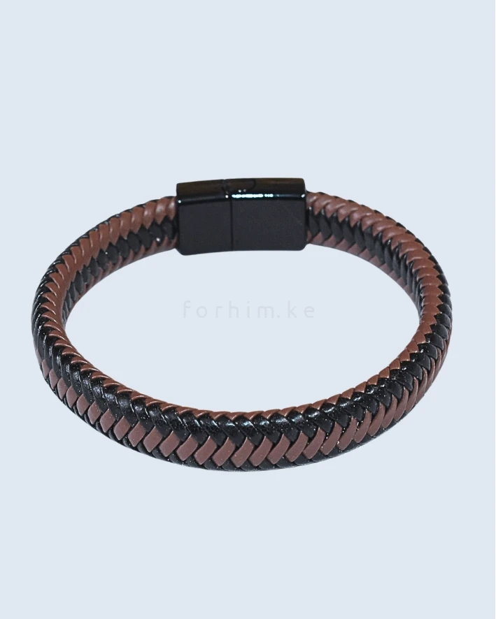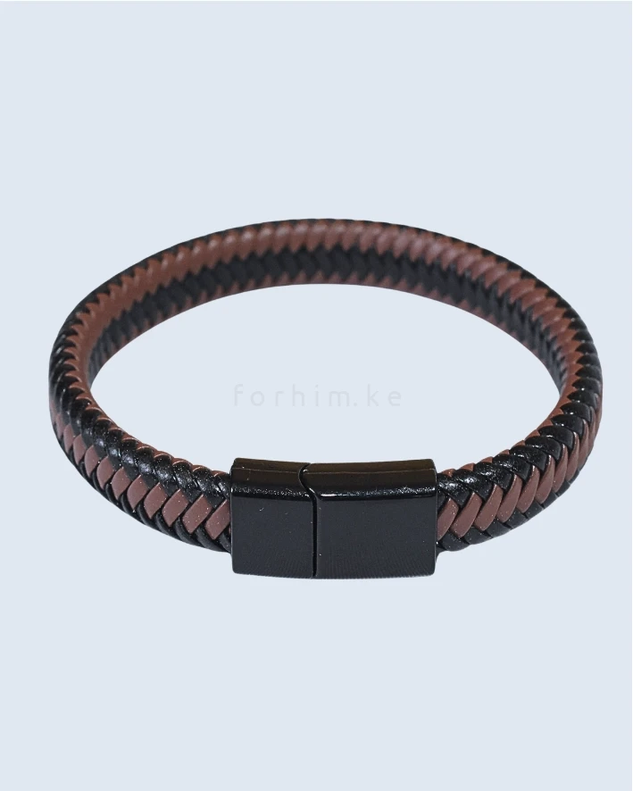 The Dual-Tone Braided Leather Bracelet: A sleek black & brown weave with a secure magnetic clasp.