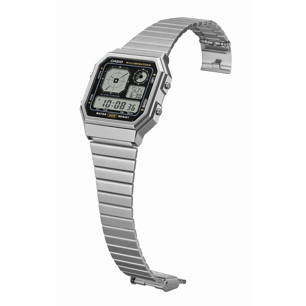 Shop the Casio A130WE-1A. A stunning retro-futuristic digital watch featuring iconic front buttons, a stainless steel band, and a 3-year battery. This watch includes a 1 year warranty.