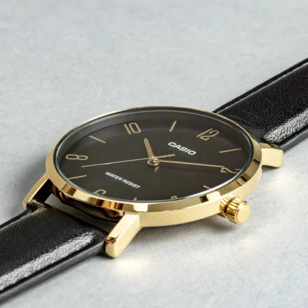 Casio builds the Casio Enticer MTP-VT01GL-1B2UDF with premium materials for maximum comfort. It features a high-quality black leather strap that feels soft against your skin. This band remains lightweight and flexible throughout a long day of meetings or travel. Furthermore, the gold-toned buckle clasp ensures a secure and custom fit. The leather develops a rich character and becomes even more comfortable as you wear it over time. Additionally, the mineral glass crystal protects the black dial from accidental scratches. Therefore, your watch maintains its sharp, showroom appearance for years. Consequently, you can trust this watch to be a dependable daily partner.