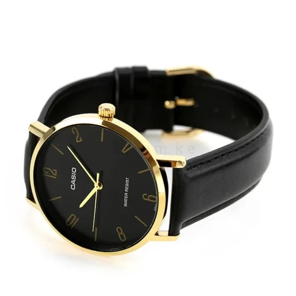 Shop the Casio Enticer MTP-VT01GL-1B2UDF at Forhim.ke. A luxurious minimalist watch featuring a gold-tone case, black dial, and premium black leather strap. This watch includes a 1 year warranty.