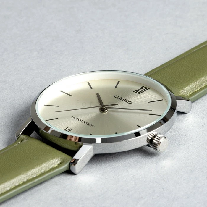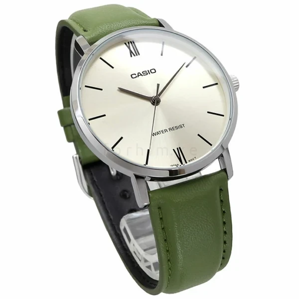 The Casio Enticer MTP-VT01L-3BUDF fits perfectly into a versatile and curated wardrobe. For instance, the green and silver tones match perfectly with navy suits, grey blazers, or even casual earth-toned outfits. Alternatively, the watch adds a layer of class to a simple white shirt and dark chinos. This versatility makes it an essential piece for your daily accessory rotation. Because it uses a high-precision quartz movement, the watch keeps perfect time without fail. In addition to its style, it offers water resistance for protection against light rain. Choosing this model means you prioritize a watch that is both visually unique and highly reliable.