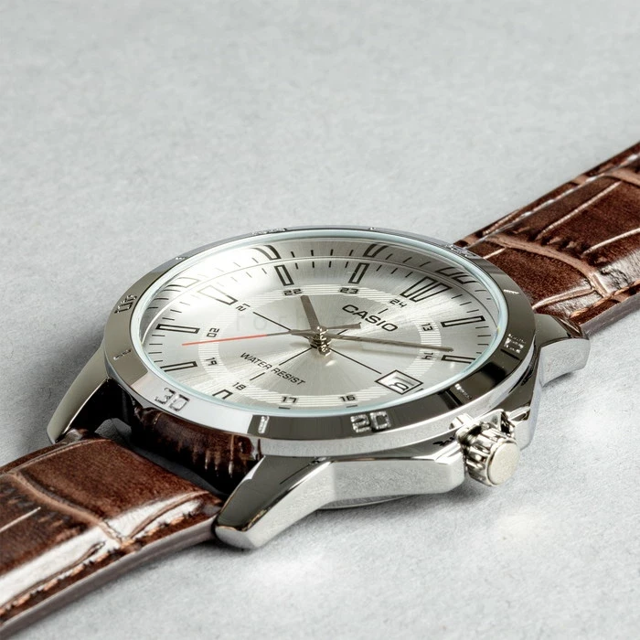 Shop the Casio MTP-V004L-7C. A classic analog watch featuring a silver dial, large Arabic numerals, a date window, and a premium black leather strap. This watch includes a 1 year warranty.