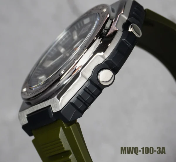 The striking forest green strap paired with a bold, high-contrast black dial makes a definitive statement. Featuring oversized Arabic numerals and luminous hands, the MWQ-100 ensures instant legibility in low-light conditions—whether you’re on a late-night trek or navigating a dimly lit city street.