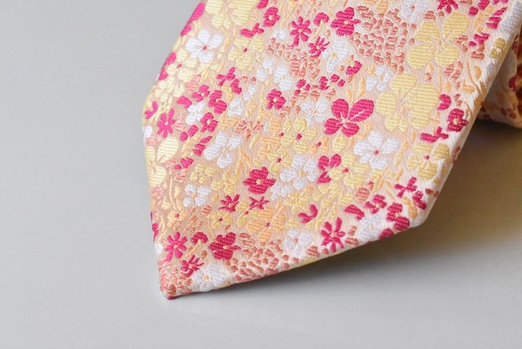 The Floral Jacquard Summer Necktie is the definitive choice for the man who embraces style during joyous celebrations. It features a stunning, intricate floral pattern woven directly into a luxurious jacquard fabric. If you want a tie that captures the vibrancy of the season while maintaining a sharp, formal edge, this model is your best choice. Many floral ties use flat, low-quality printing that looks cheap under bright sunlight. However, this model uses a sophisticated multi-layered weave to create depth and texture. Furthermore, the harmonious blend of warm golds, soft creams, and vibrant pinks ensures you stand out for the right reasons. Consequently, you receive a neckpiece that elevates your presence at weddings, garden parties, or high-end social gatherings.