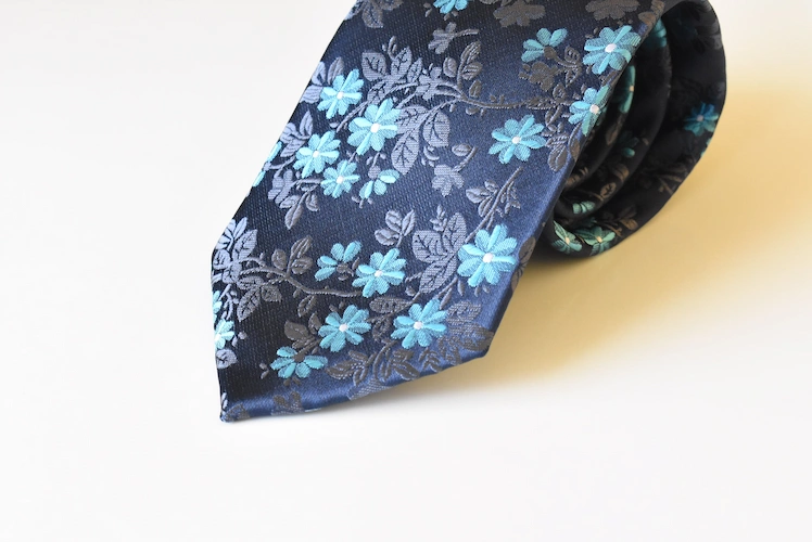 The clarity and high contrast of the floral pattern make this tie an exceptional choice when you want to make a confident statement. For business settings, combine it with a crisp white dress shirt and a black or charcoal gray suit; this allows the teal blossoms to provide an immediate, refreshing visual accent. This accessory is particularly effective for weddings, formal parties, or any event where a unique and sophisticated pattern is desired. The 7cm contemporary width suits most modern suit lapels without appearing bulky. Therefore, it ensures you always maintain a sleek, professional profile.