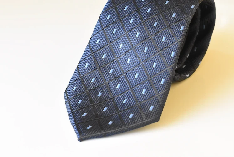 This tie uses durable polyester fabric, chosen for its excellent knot retention and wrinkle resistance. It features a rich, dark navy blue base color with a subtle woven texture. The pattern consists of small white or light blue dots/squares arranged in a precise grid. This repeating micro-pattern adds sophisticated visual interest without becoming distracting. The width is a modern 7 cm, placing it in the contemporary slim category. Furthermore, the strong polyester fabric ensures a crisp, neat knot and consistent shape all day.