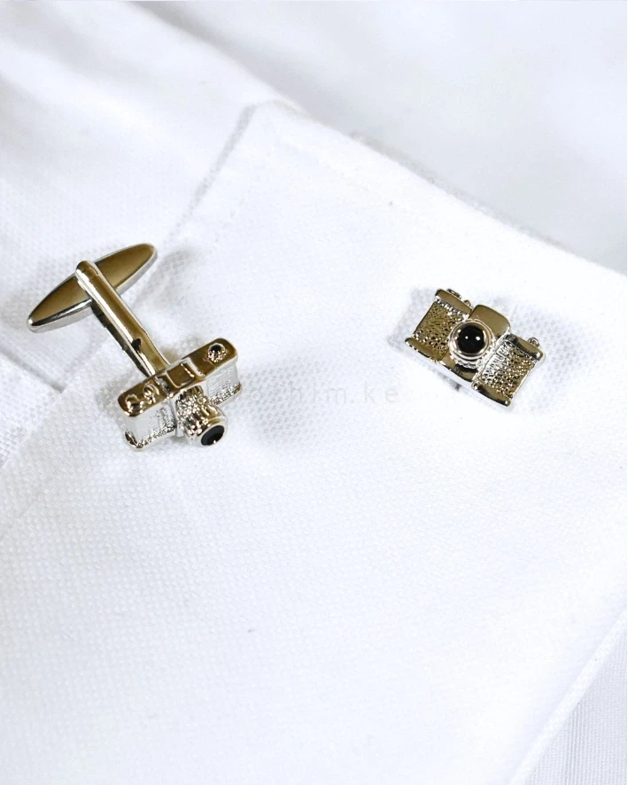 Each cufflink is meticulously shaped like a classic rangefinder camera, complete with a textured body and a prominent black enamel “lens” that adds a touch of realism. Set in a brilliant silver-tone finish, they are the perfect conversation piece for weddings, media events, or creative boardroom meetings.