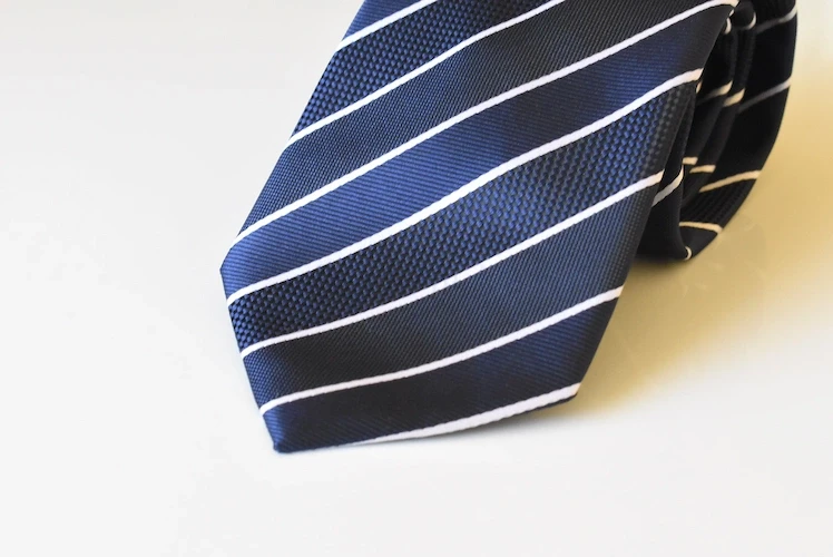 We craft this unique striped necktie from high-quality polyester. This provides exceptional durability and easy maintenance. Unlike delicate silk, polyester inherently resists wrinkles and stains. This ensures the blue striped tie maintains its sharp appearance throughout a demanding day. Moreover, the careful construction of the lining helps the fabric drape smoothly. This allows you to achieve that perfect dimple just below the knot. Ultimately, this accessory offers a luxurious aesthetic combined with the practical, easy-care benefits of a resilient synthetic fiber.