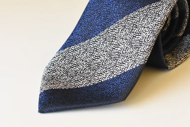 This necktie uses durable polyester and measures a versatile 7cm in width. The design features bold, broad diagonal stripes that alternate between two distinct elements. One block is a smooth, solid dark navy blue, providing classic depth and authority. The adjacent block features a highly textured, woven silver or light gray-blue, creating a dynamic, almost pixelated effect. This powerful dual-texture detailing provides exceptional visual weight and structure, instantly elevating a simple shirt and suit combination. You will find that it ties a sharp, neat knot effortlessly every time.