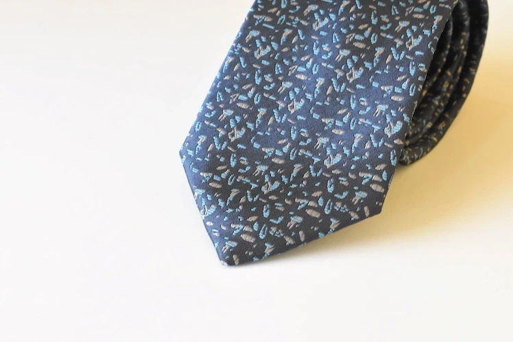 The complex blue palette makes this tie an immediate focal point. For professional settings, pair it with a crisp white dress shirt and a charcoal or light grey suit. This combination allows the rich texture and multiple shades of blue to provide a refreshing, confident accent. Furthermore, this tie works exceptionally well with navy blazers or tweed jackets. Specifically, it adds a touch of playful sophistication ideal for business-casual settings or summer events. The 7cm contemporary width suits most modern suit lapels without appearing bulky, so it ensures you maintain a sleek, professional profile.