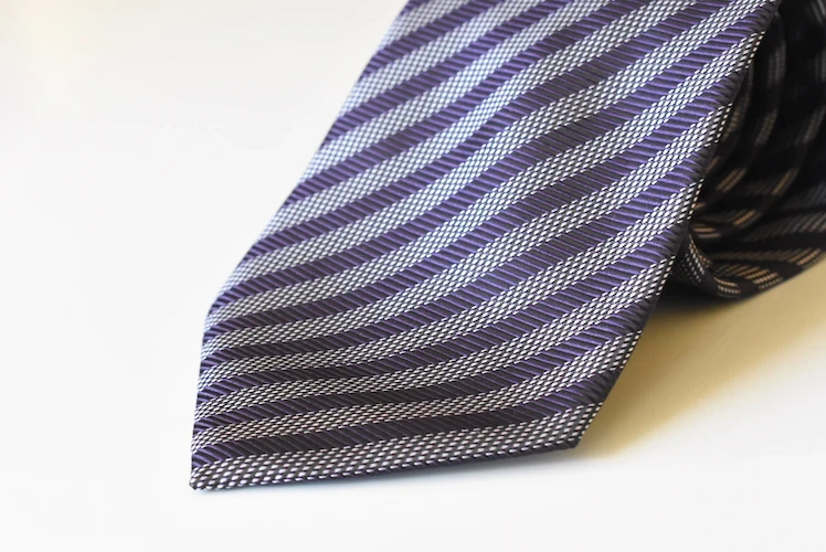 This necktie uses durable polyester and measures a versatile 7cm in width. The design features a deep charcoal or near-black base that is diagonally segmented by thin, repeating silver or light gray stripes. However, these stripes are not solid blocks of color. Instead, the woven pattern creates a striking herringbone or subtle zigzag texture that catches the light and adds a dynamic, almost three-dimensional appearance to the tie face. This unique textural detailing provides sophisticated depth and a powerful sense of structure. You will find that it ties a sharp, neat knot effortlessly every time.
